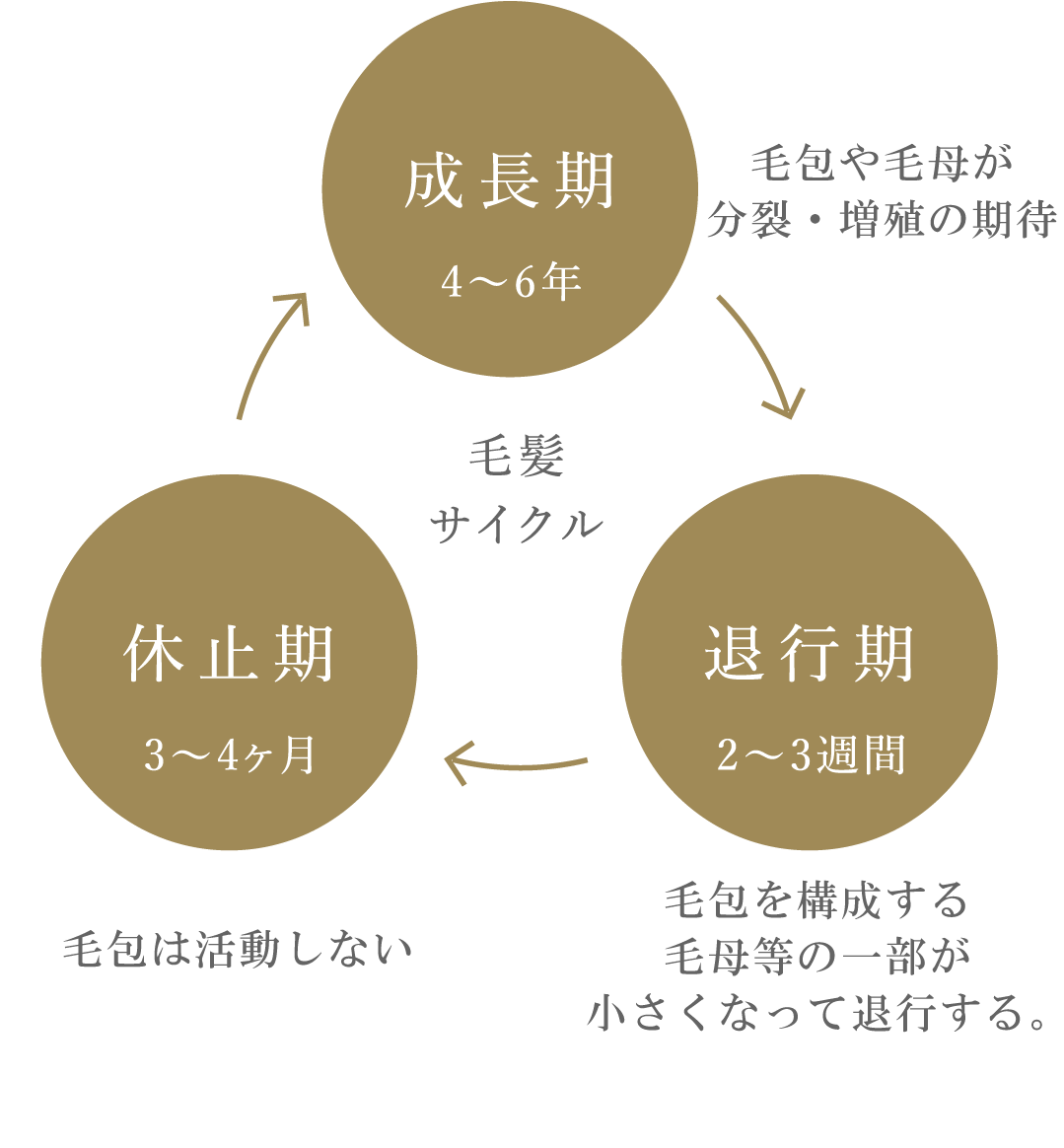当院の毛髪組織再生治療は、この退行期と休止期にあるアポトーシスの数を減少させる抗アポトーシス作用を促し、毛包周囲の新生血管増生作用や毛母細胞の増殖を促進させるIGF-1(インスリン様増殖因子)がさらに毛根ステムセルの分化を促し、毛周期の成長期を延長させることが期待できます。