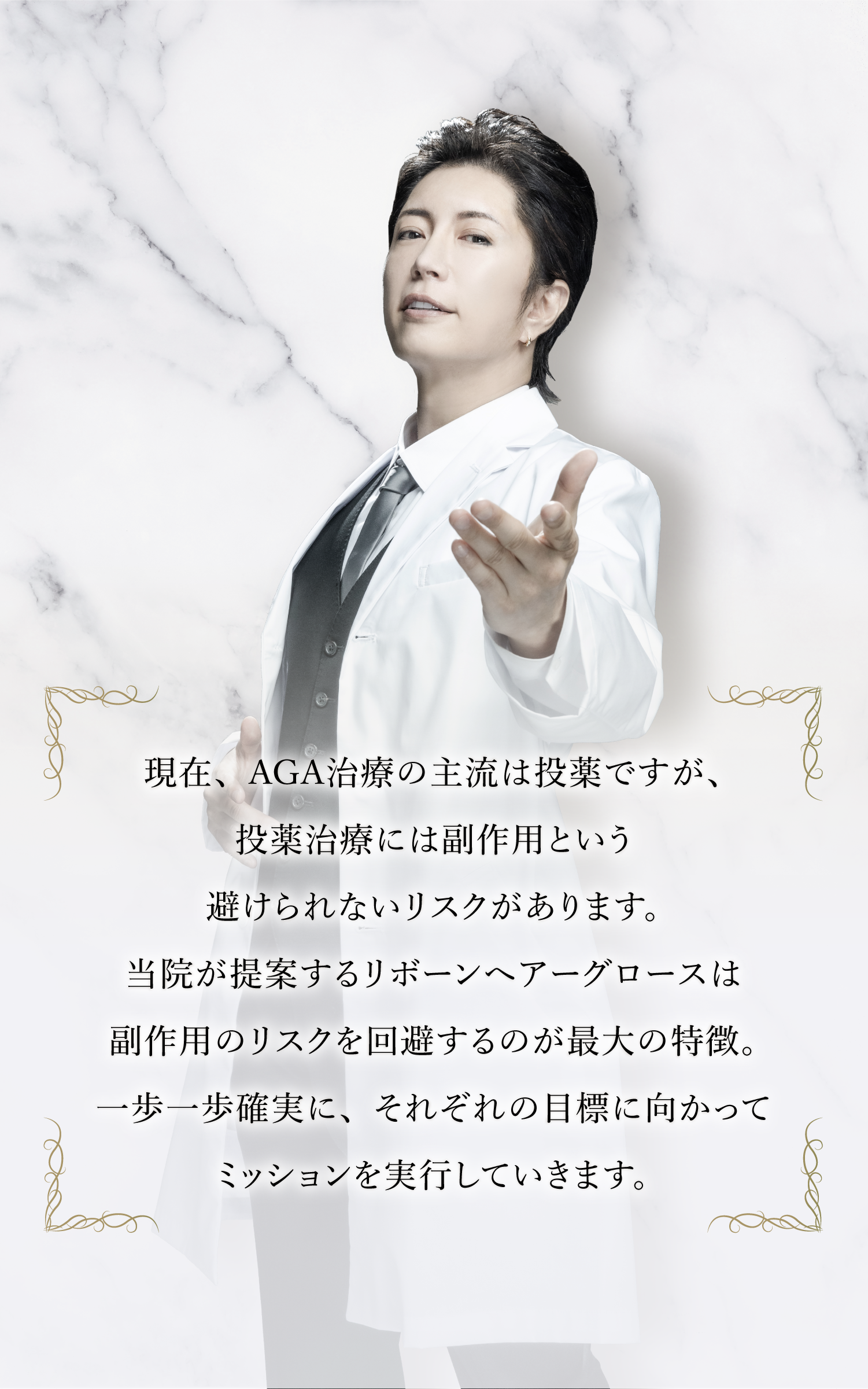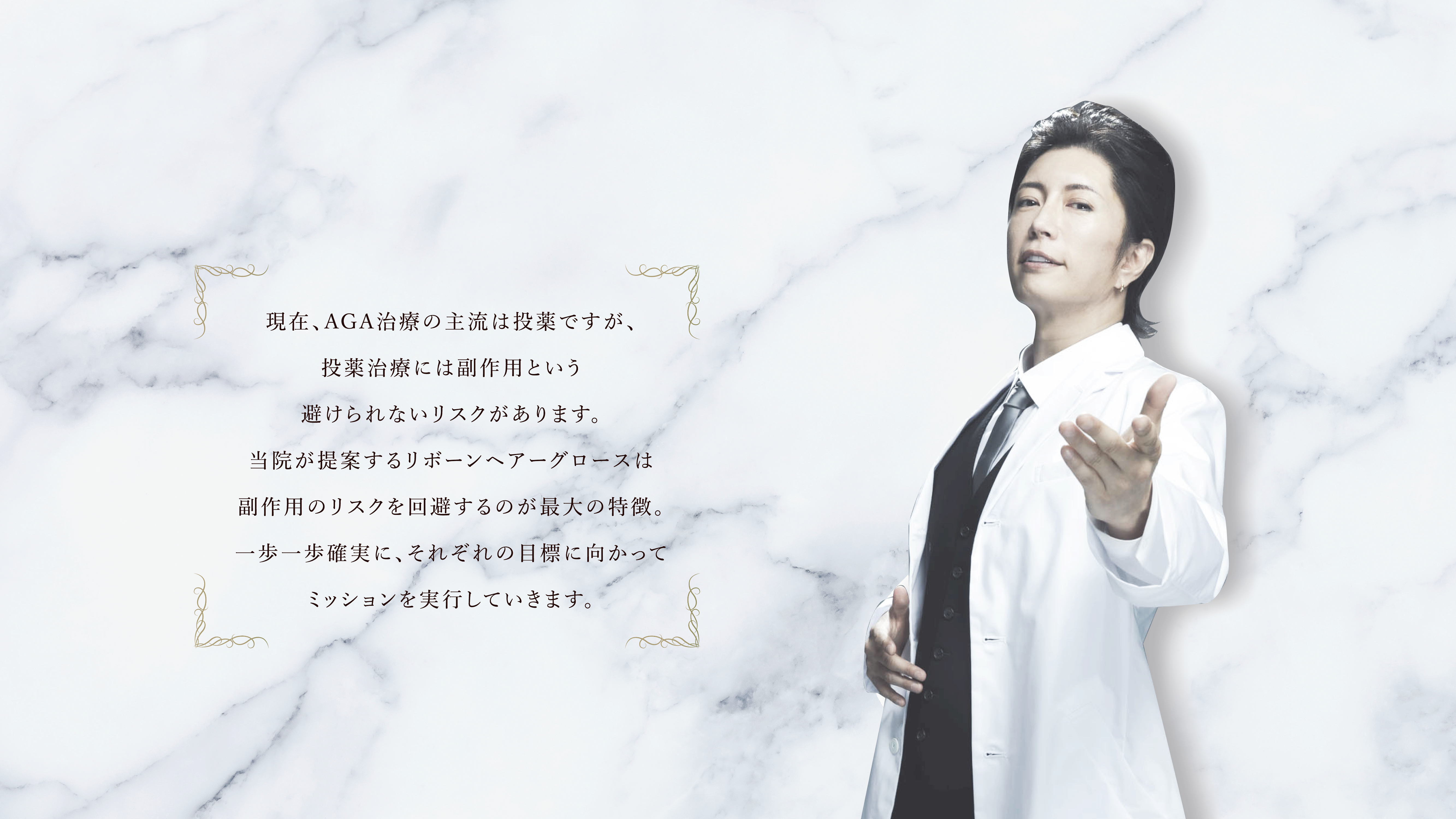 30代前半に頭頂部が、半ばにはM字が進行したため、内服薬の服用と第一類医薬品の発毛剤の使用を開始しました。半年ほどで改善が見られましたが、副作用とみられる全身倦怠感や男性機能の低下などの症状が出始めた為、健康を優先し、1年半ほどで内服を中止しました。その後、一気にリバウンドとみられる症状が始まり、投薬開始前よりも薄毛が急速に進行しました。噂には聞いていましたが、薬を一度服用すると、一生続けなければならないという現実を身をもって知りました。このまま薄毛が進行するのだけは避けたいと悩んだ結果、本クリニックを受診、薬に頼らないAGA治療を開始しました。クリニックは完全予約制、完全個室ですので、プライバシーがしっかりと保たれています。治療後に行われるヘアアートメイクは気になる薄毛部分を目立たないよう隠してくれるので、クリニックを出るときの自分に自信が持てます。治療の効果なのか、体調も以前より良く、忘れないように薬を飲んだり塗布するストレスもなく、自然に薄毛が改善されてきています。